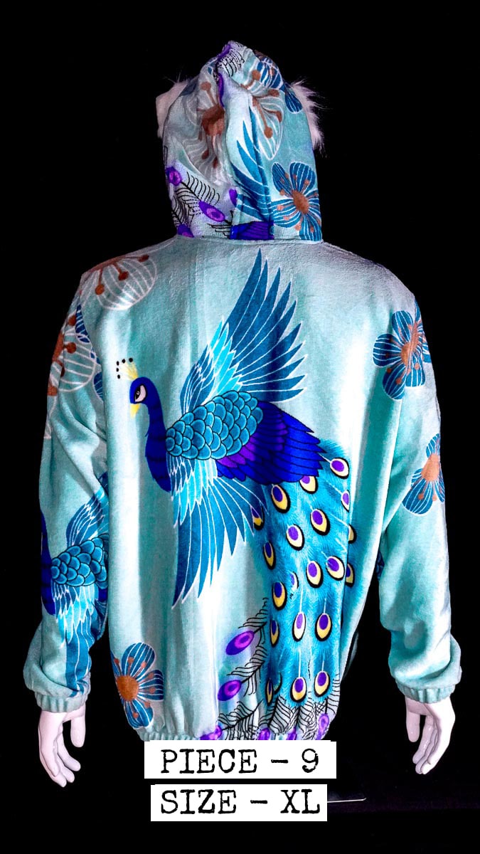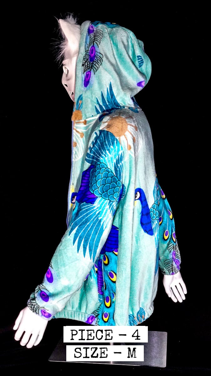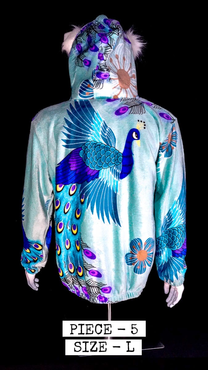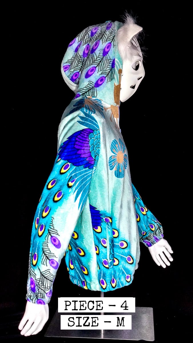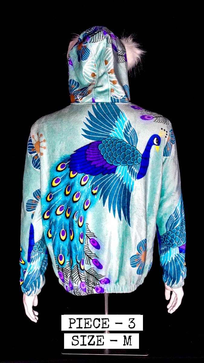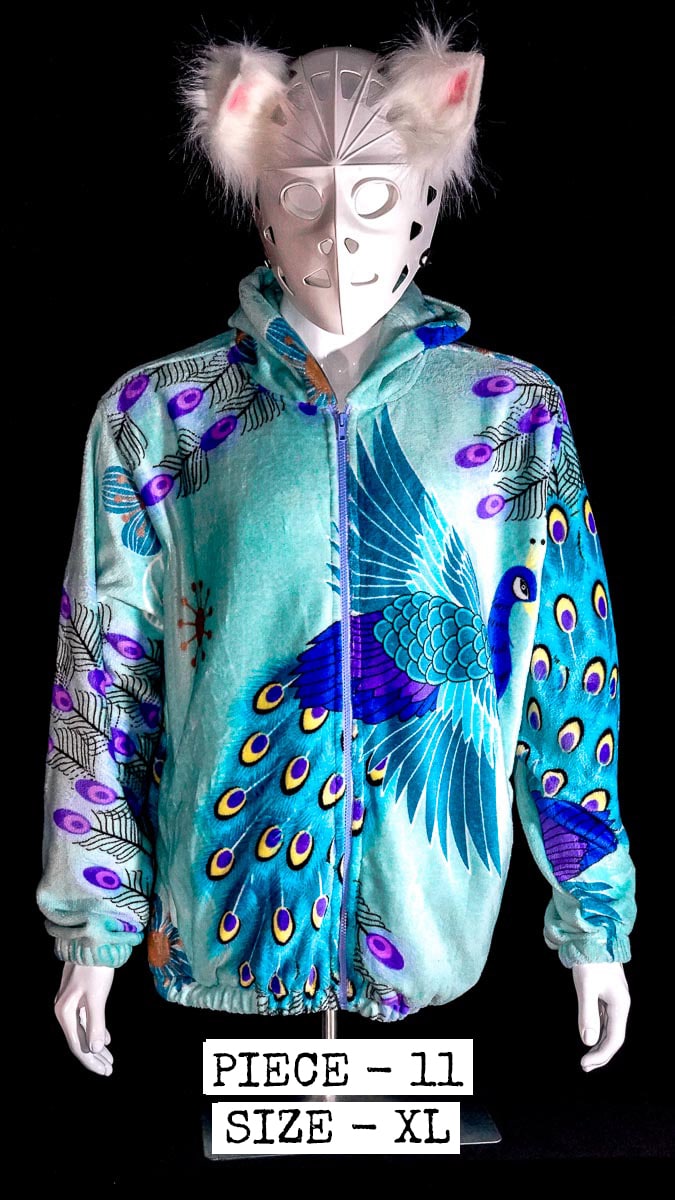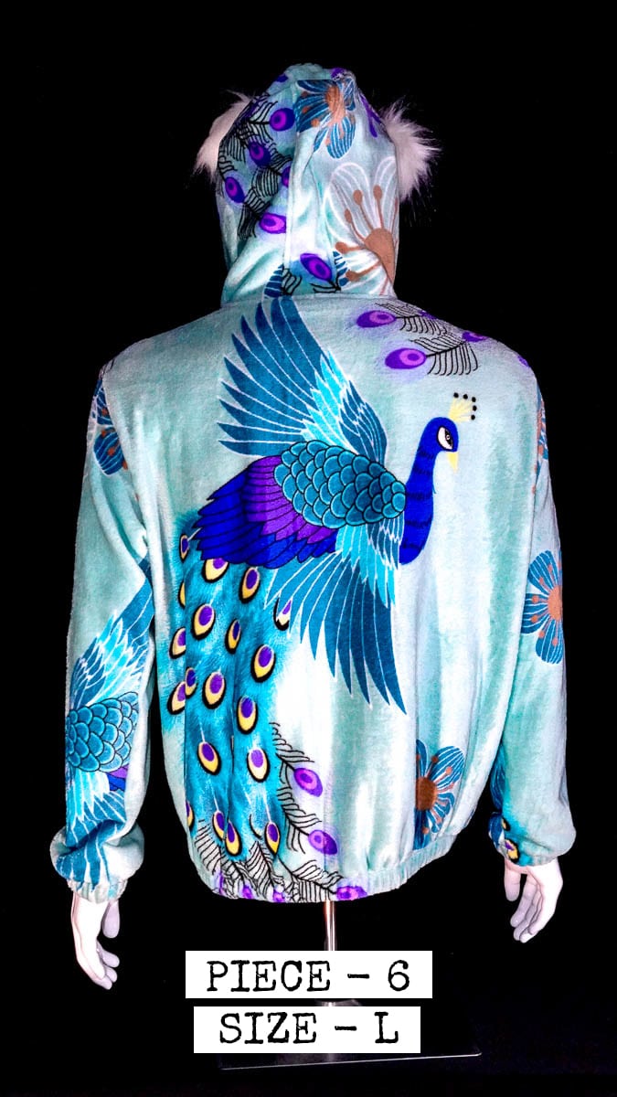 This design features oversized blue peacocks in flight, layered with large peacock feather patterns that create texture, rhythm, and visual depth. White floral accents interrupt the composition just enough to keep it from symmetry, giving the jacket an abstract, almost painted quality.