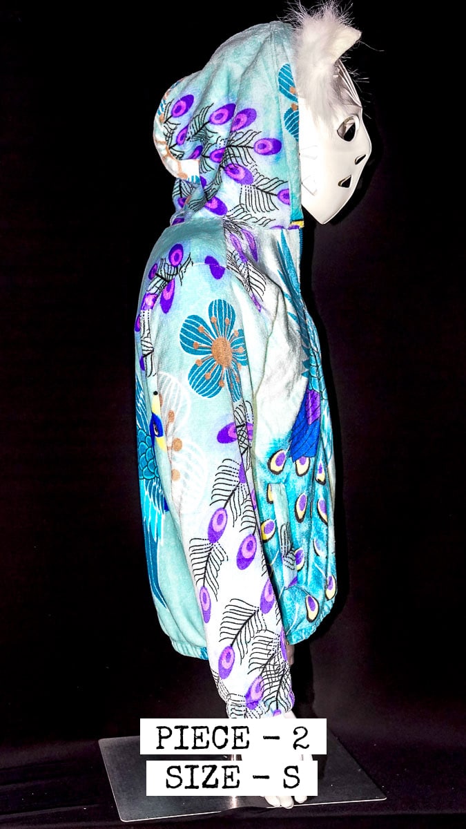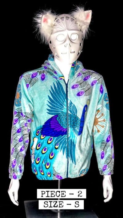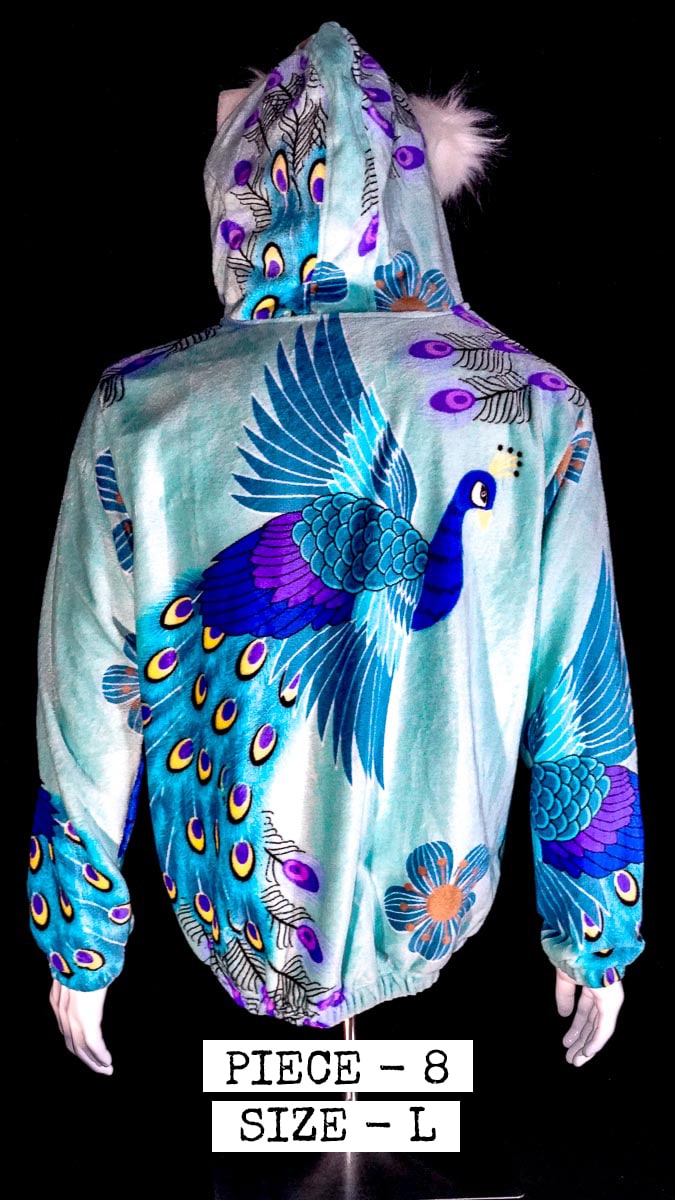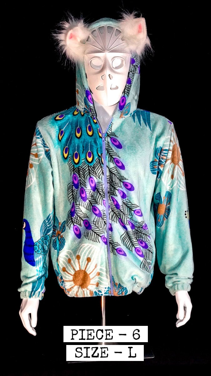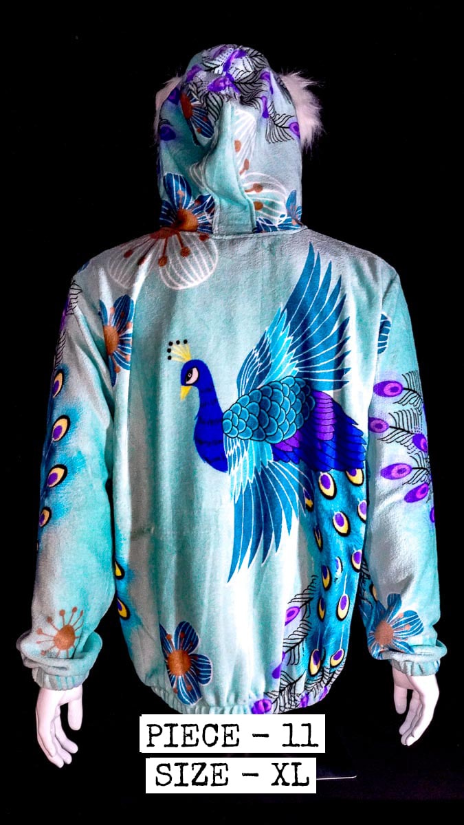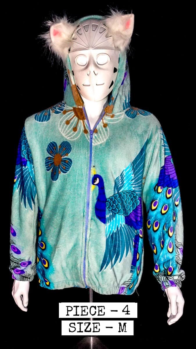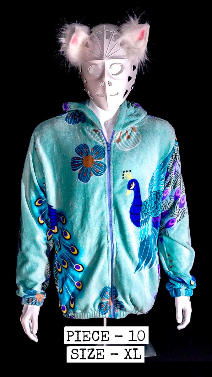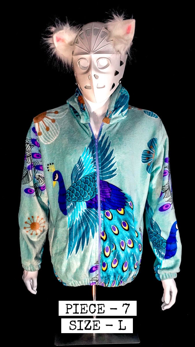 This design features oversized blue peacocks in flight, layered with large peacock feather patterns that create texture, rhythm, and visual depth. White floral accents interrupt the composition just enough to keep it from symmetry, giving the jacket an abstract, almost painted quality.