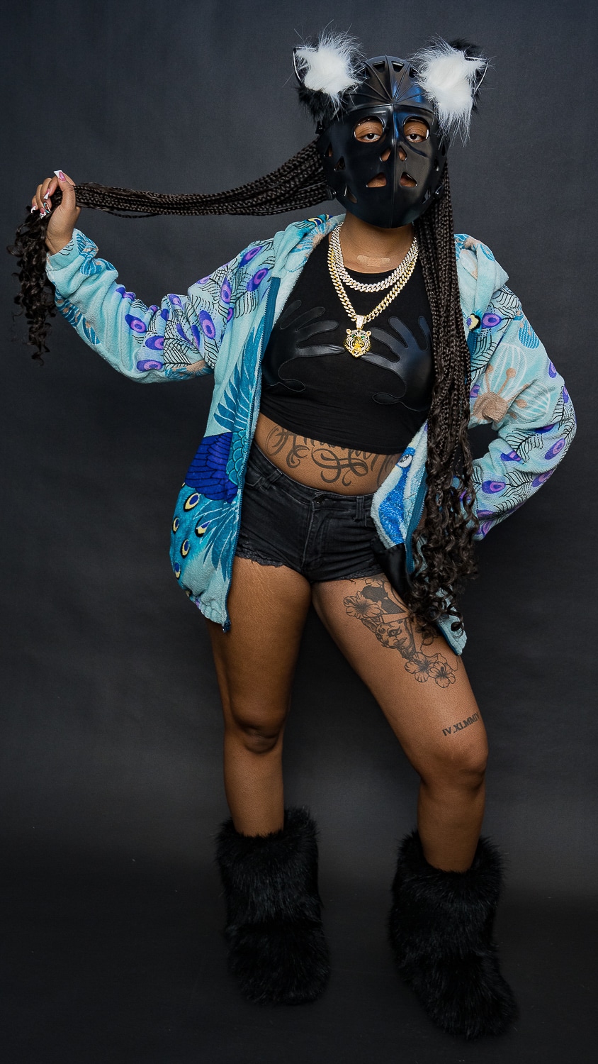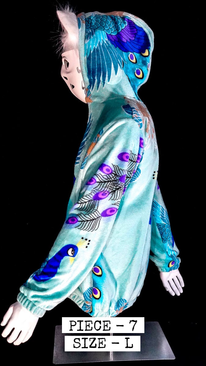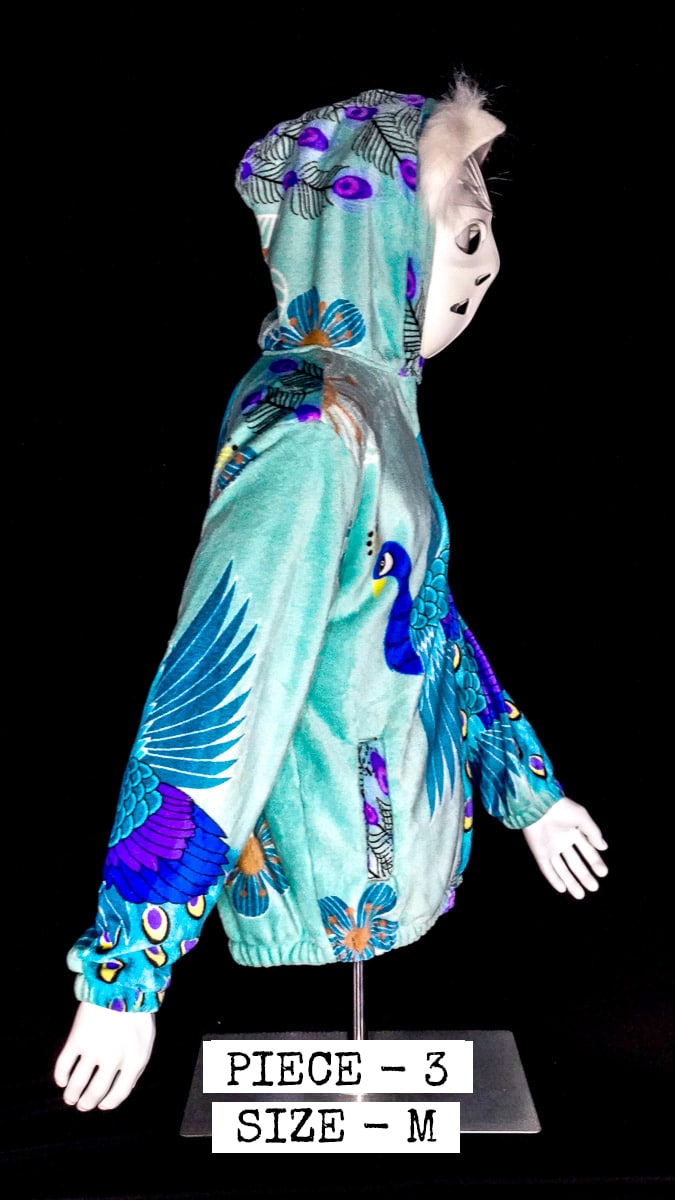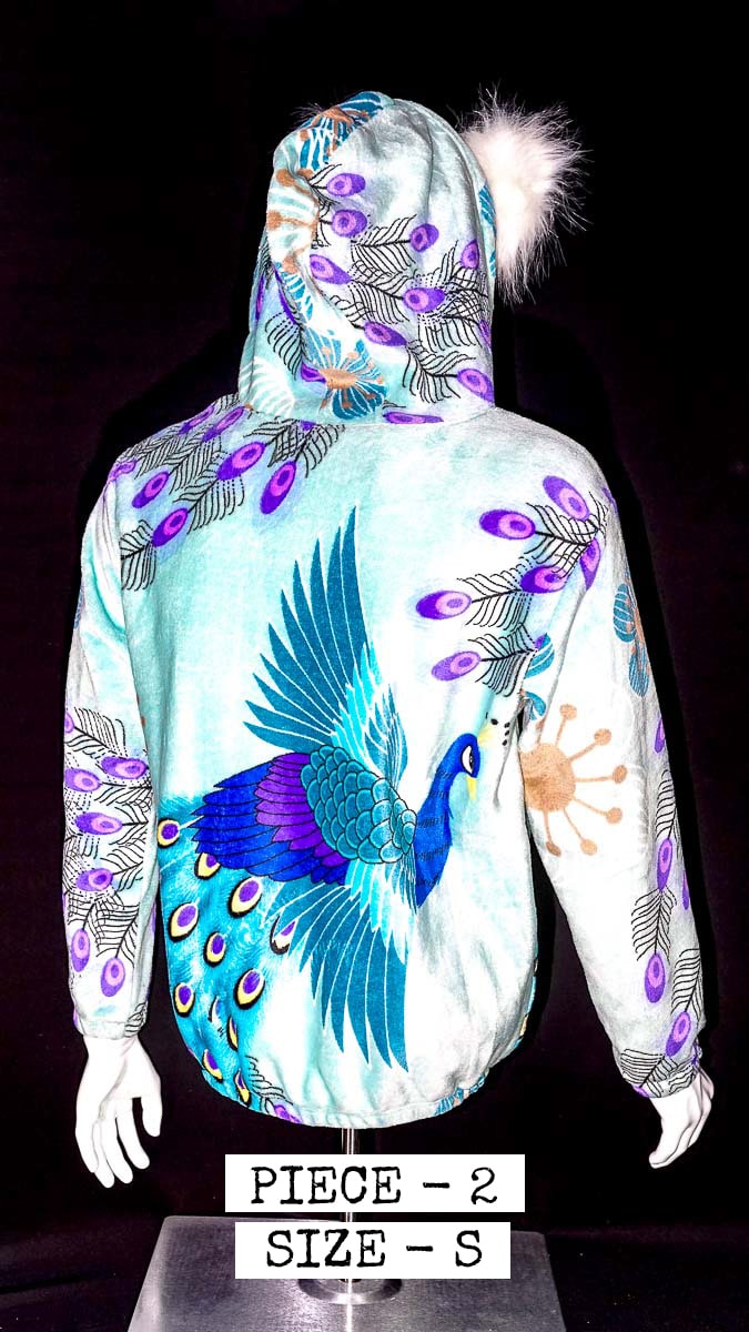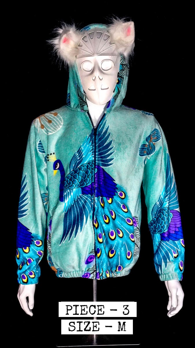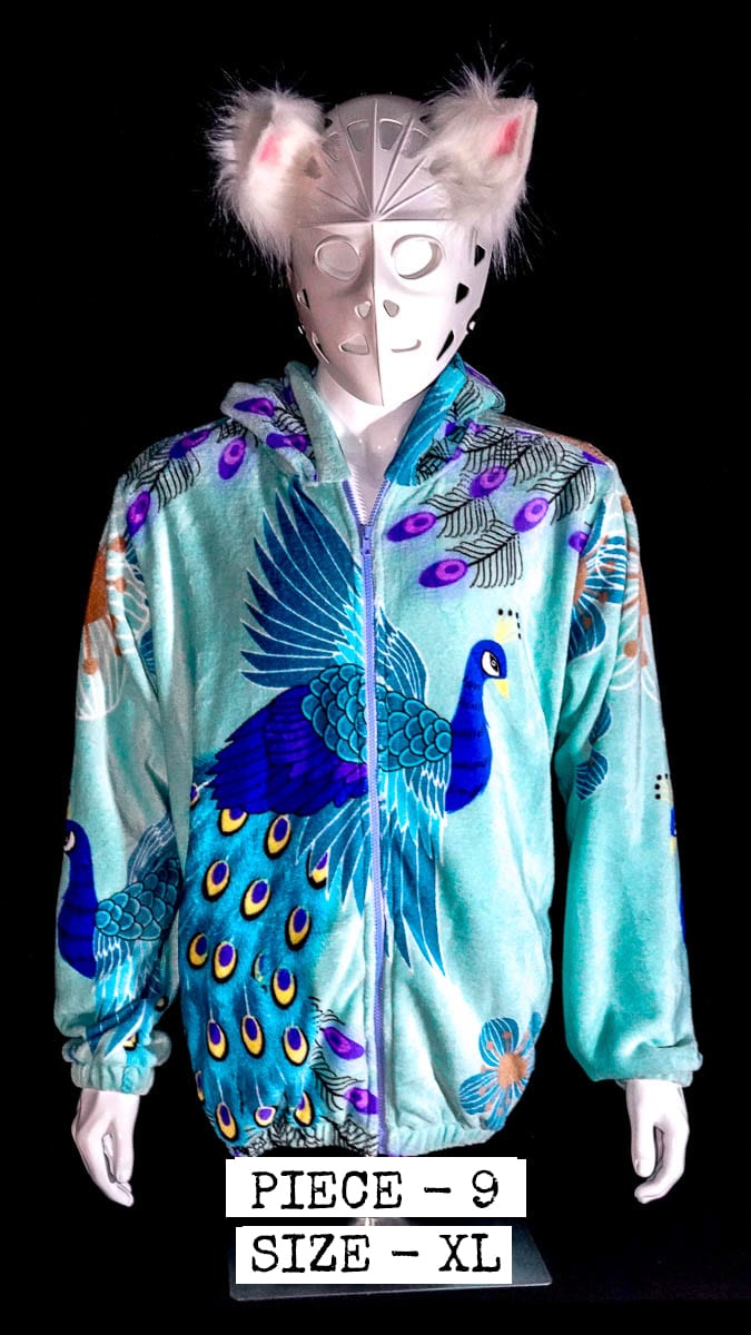 This design features oversized blue peacocks in flight, layered with large peacock feather patterns that create texture, rhythm, and visual depth. White floral accents interrupt the composition just enough to keep it from symmetry, giving the jacket an abstract, almost painted quality.