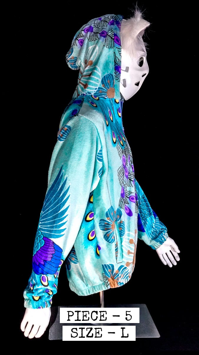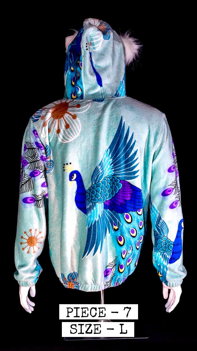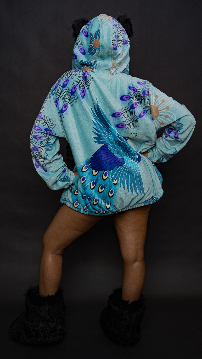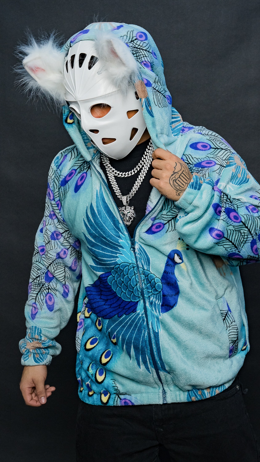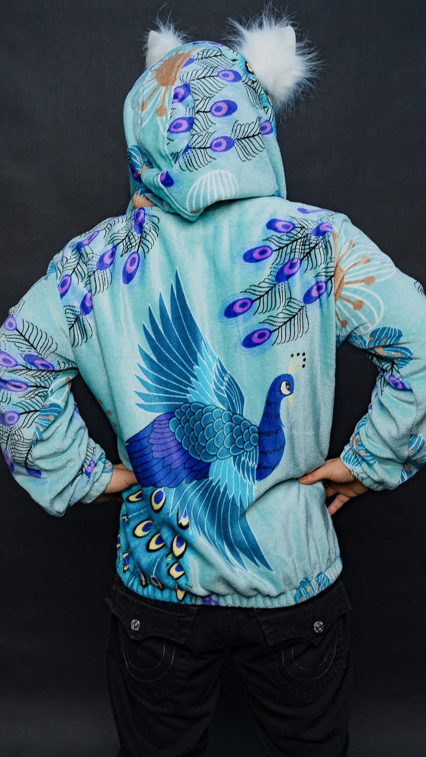 Rendered on a light blue base, the artwork feels expansive rather than aggressive. The peacocks repeat across the front, back, sleeves, and hood, creating the sense of movement continuing even when the wearer stands still.