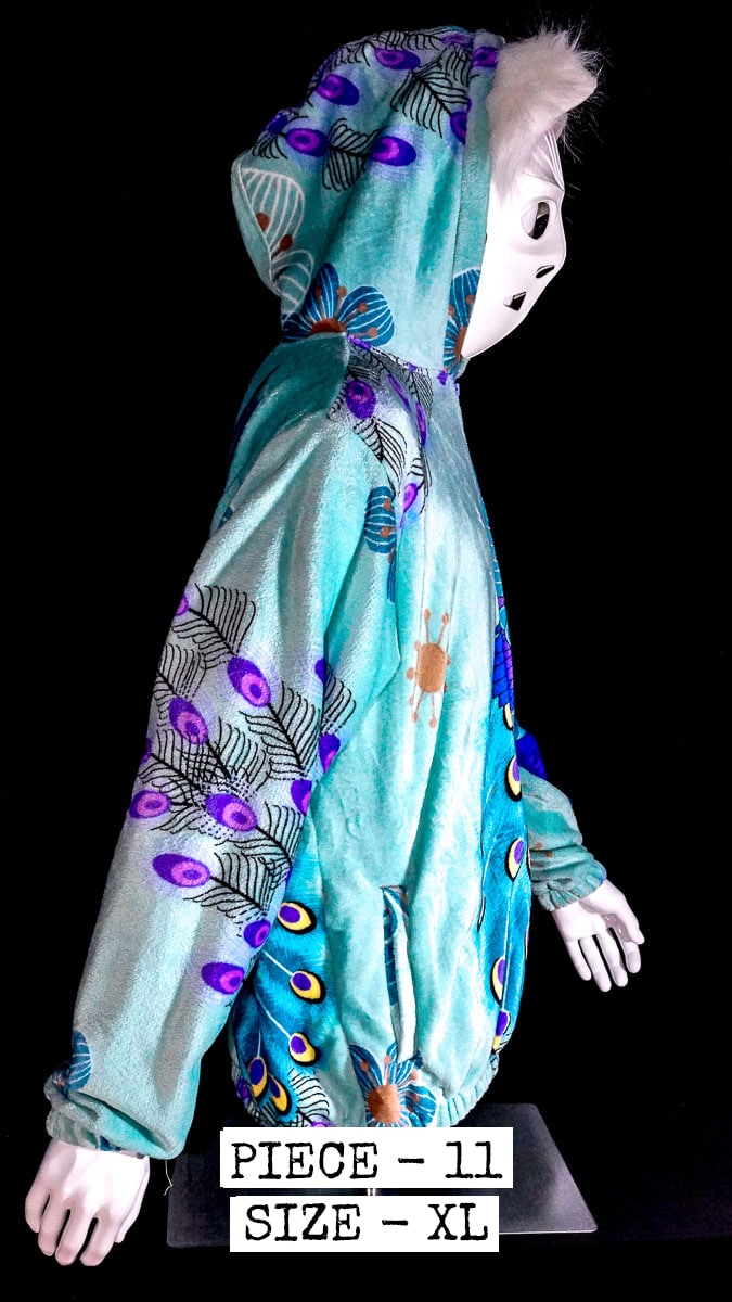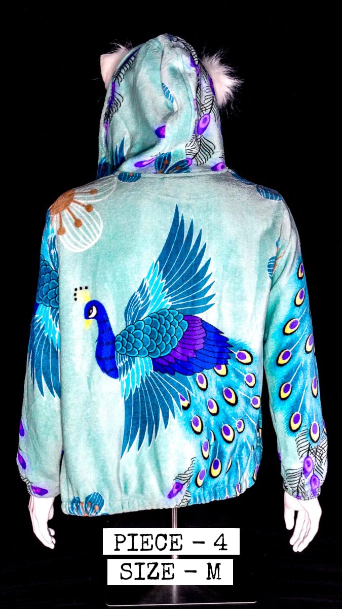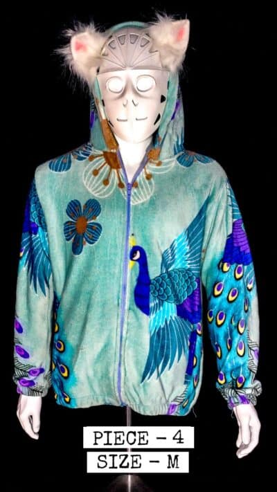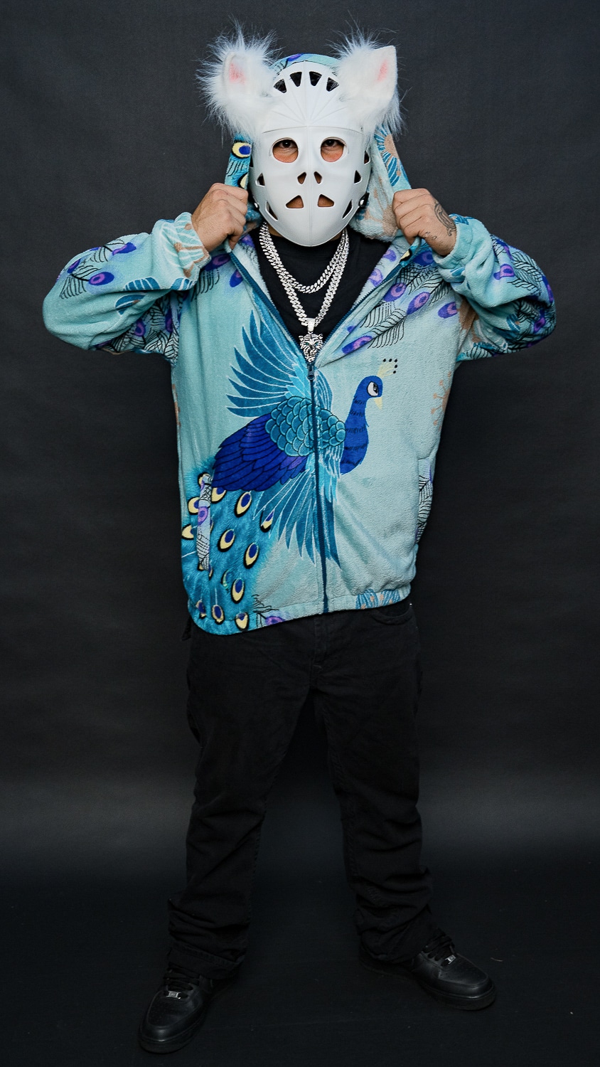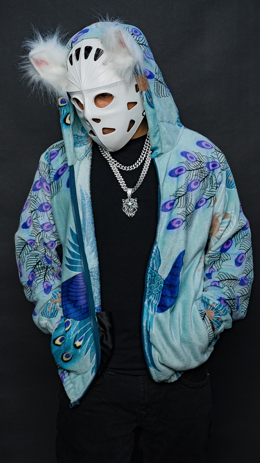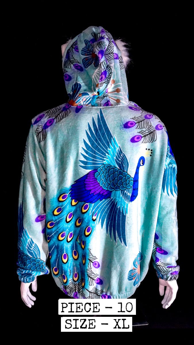 Rendered on a light blue base, the artwork feels expansive rather than aggressive. The peacocks repeat across the front, back, sleeves, and hood, creating the sense of movement continuing even when the wearer stands still.