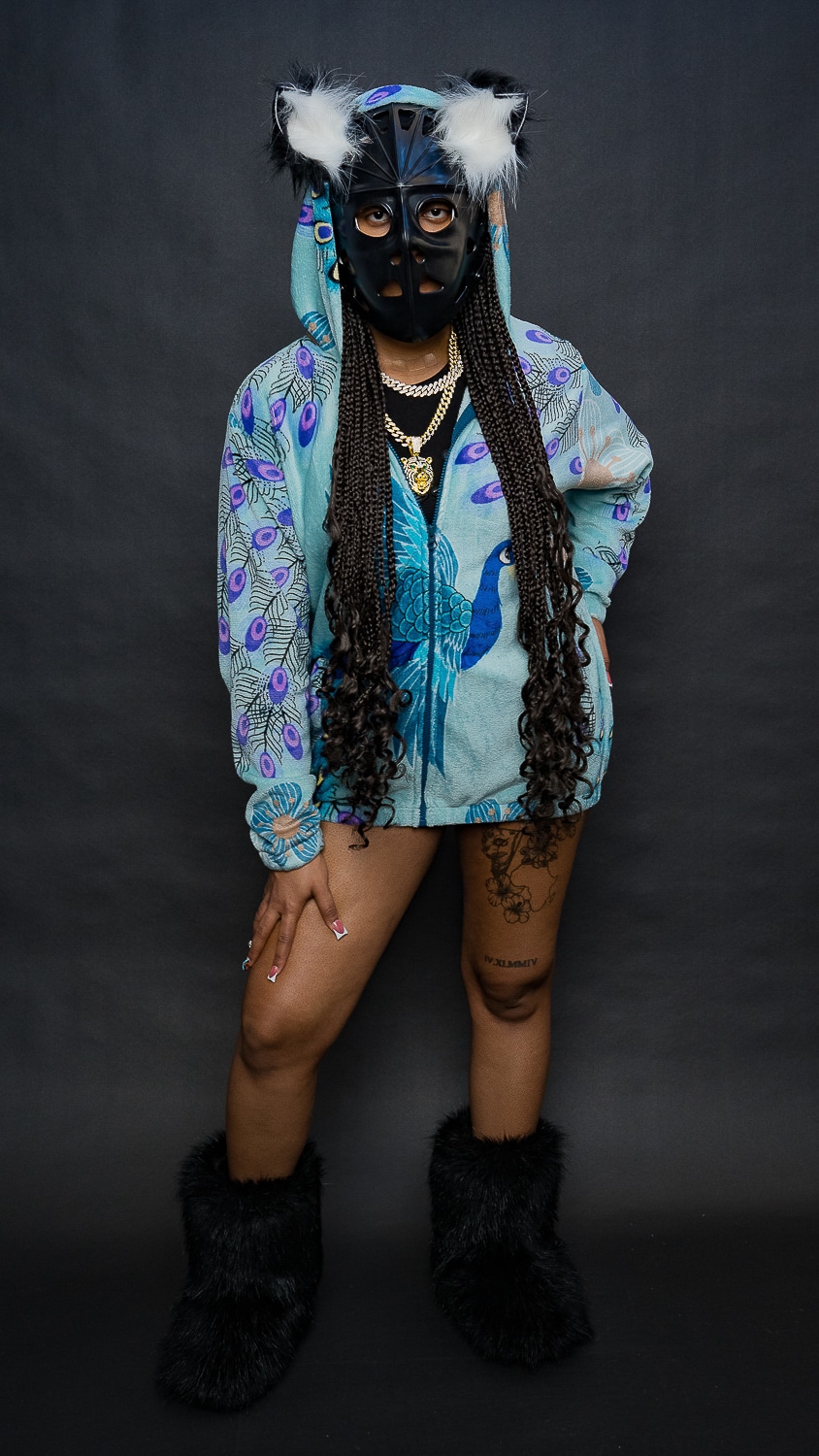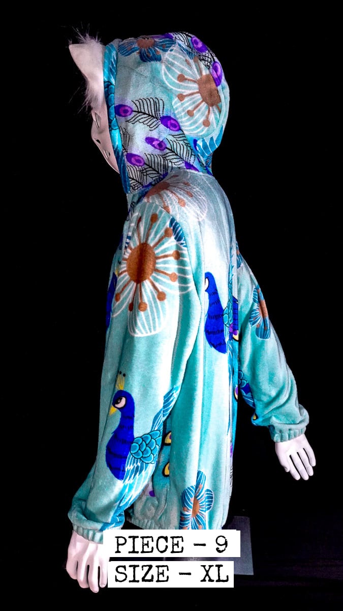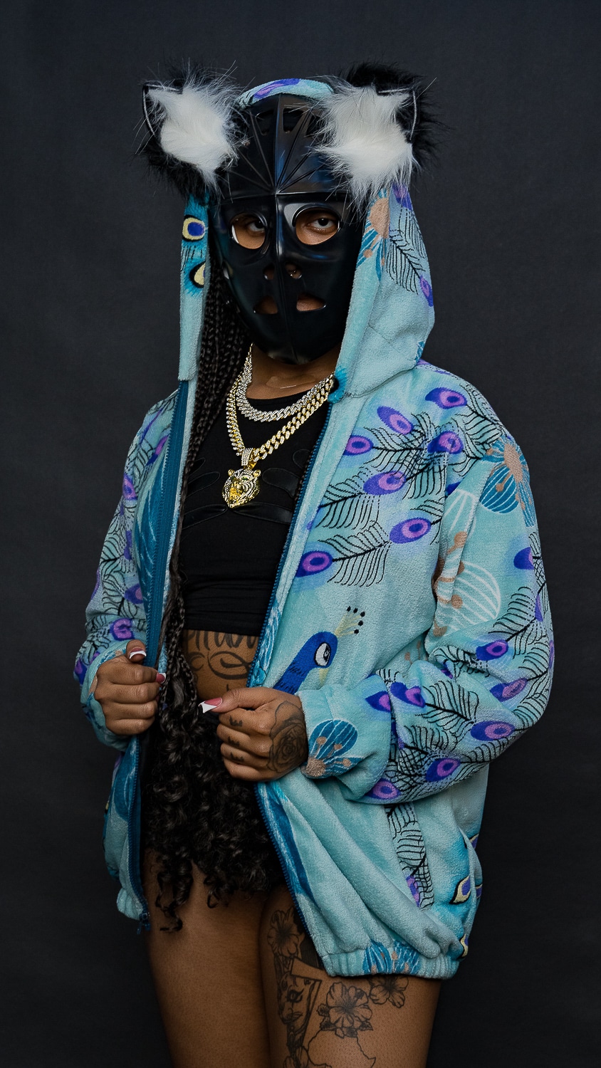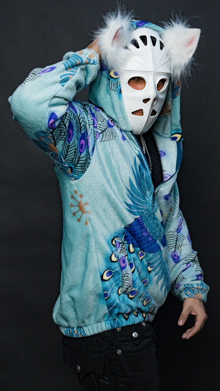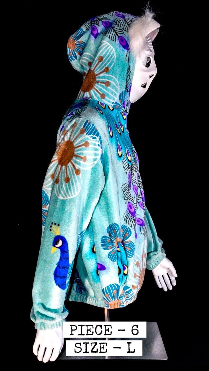 Rendered on a light blue base, the artwork feels expansive rather than aggressive. The peacocks repeat across the front, back, sleeves, and hood, creating the sense of movement continuing even when the wearer stands still.