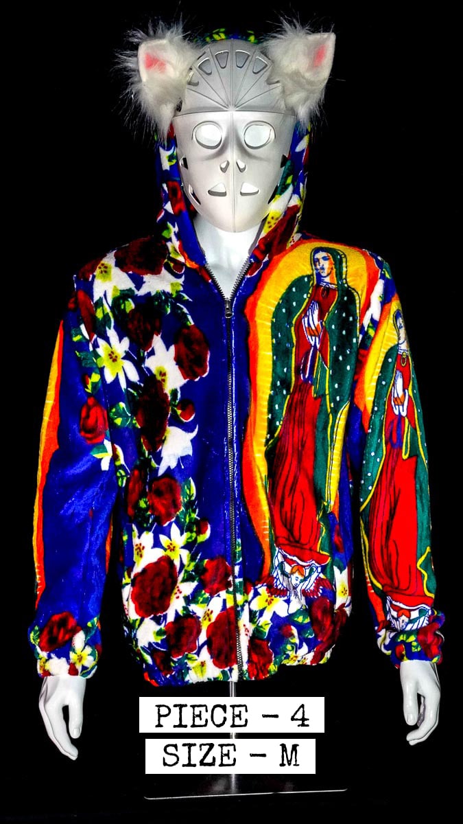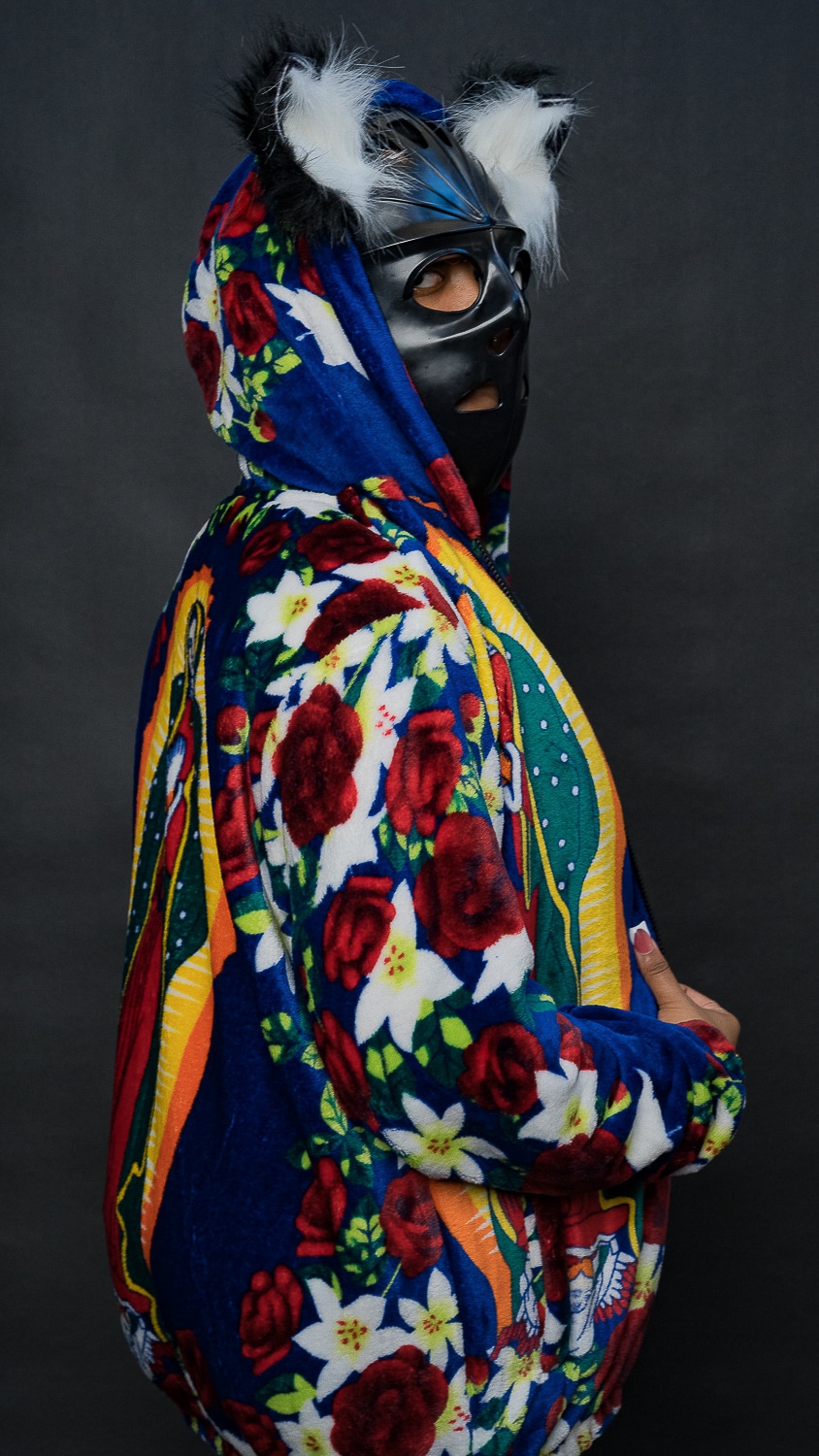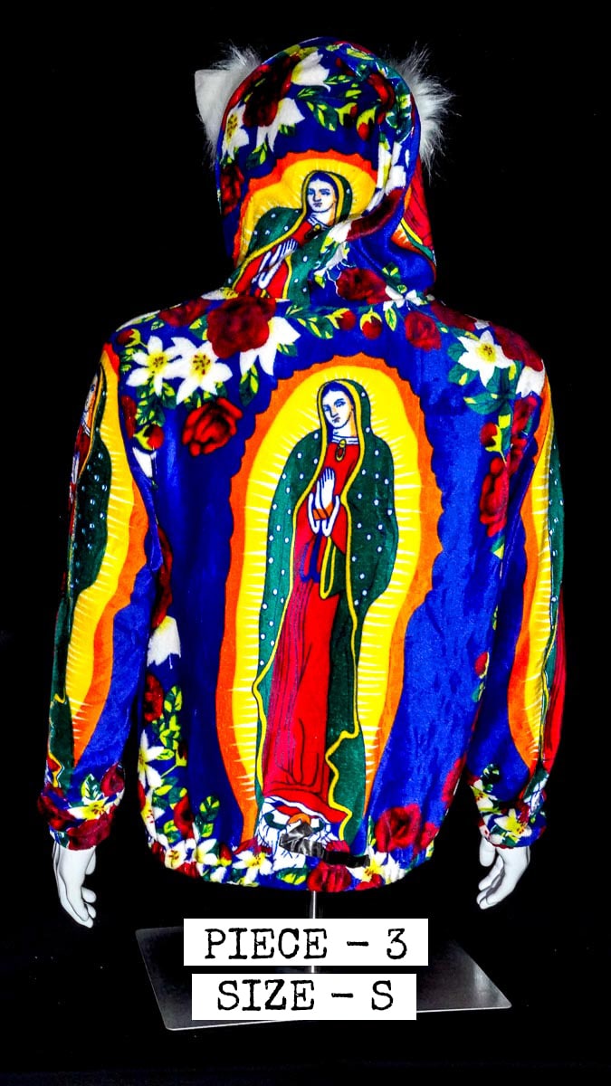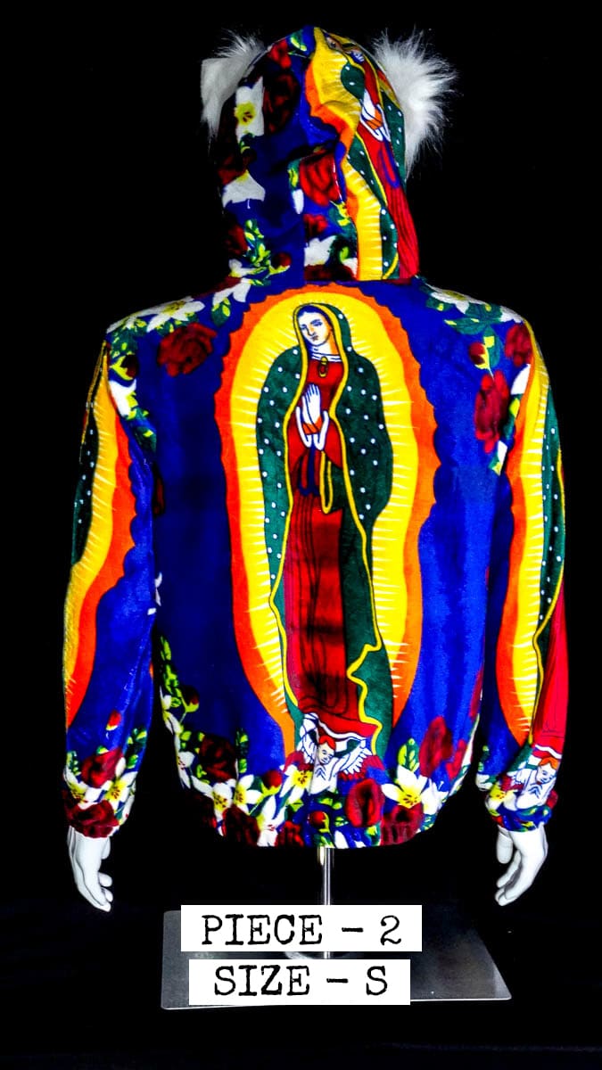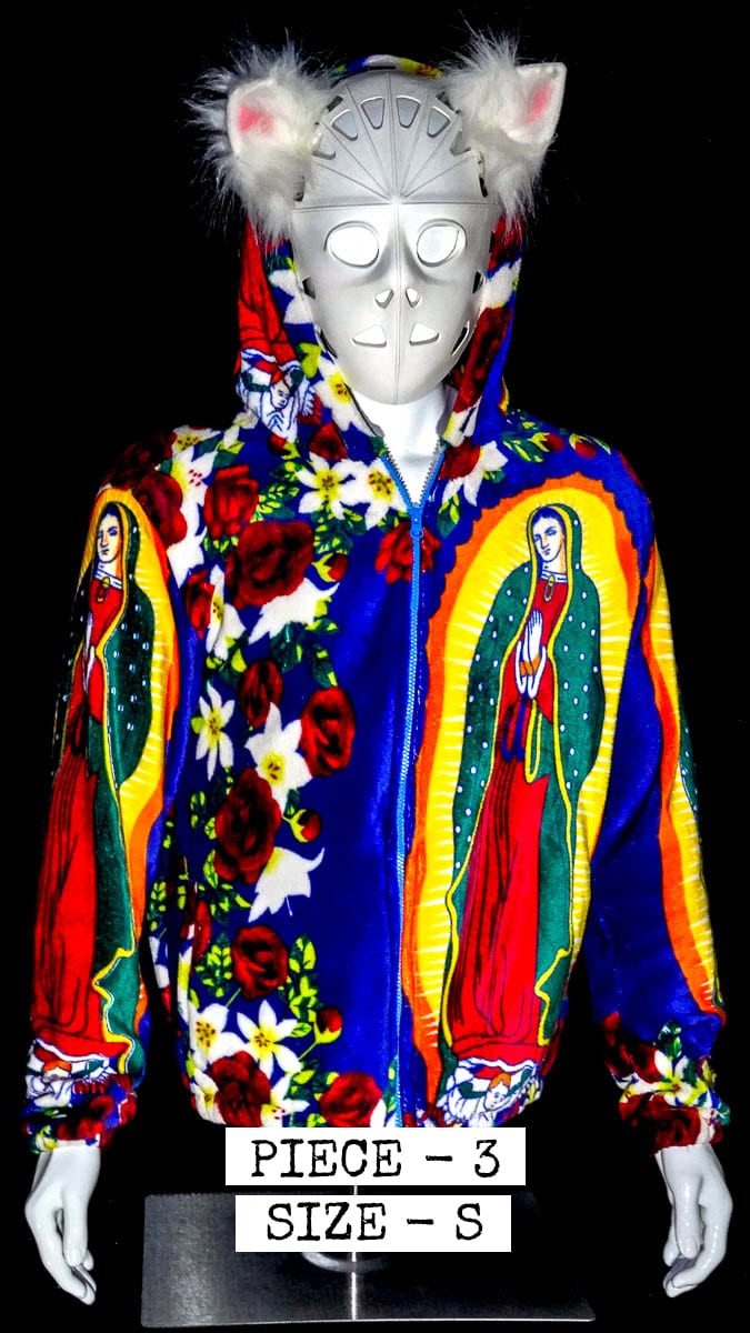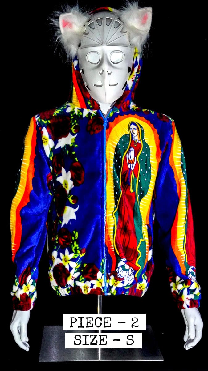 The Maria is a RAW-class statement jacket built around repetition and presence. Featuring the Virgin of Guadalupe across the front, back, and sleeves, with roses, white florals, and cherubs throughout, it’s lightweight, unlined, and unapologetically vivid.