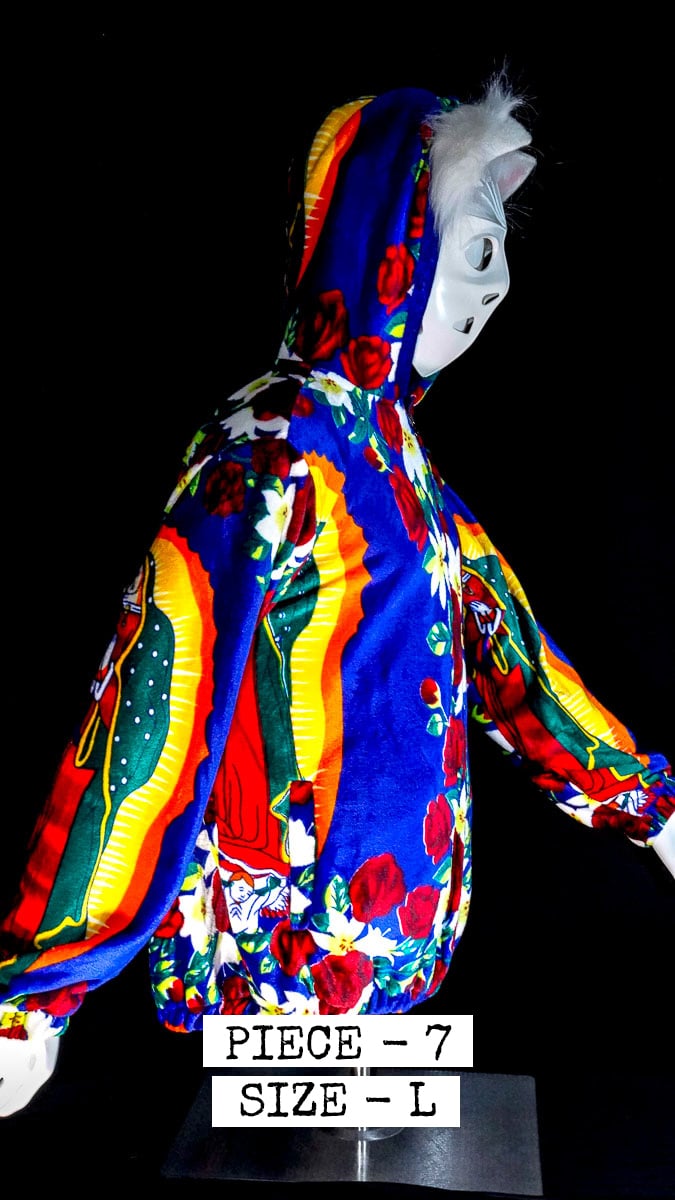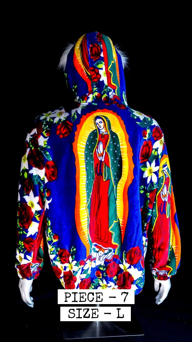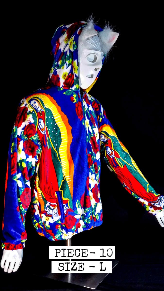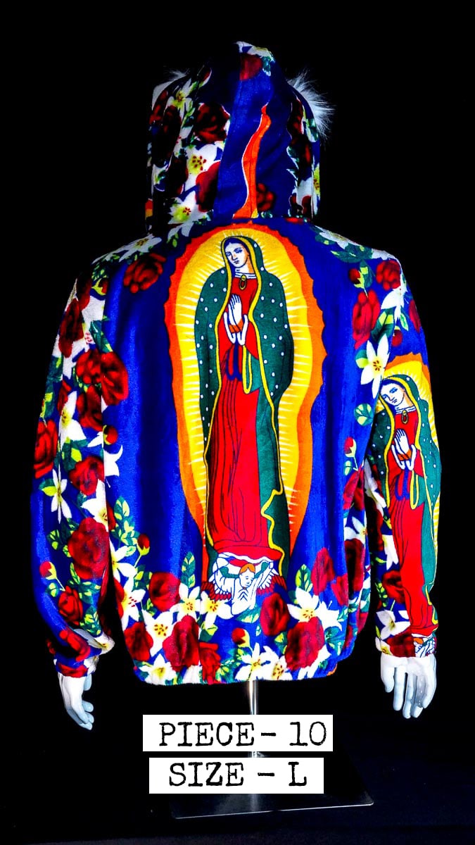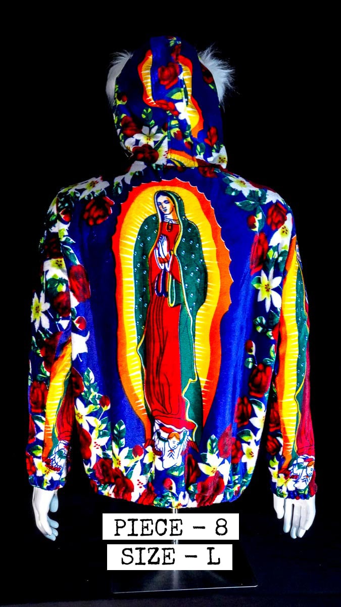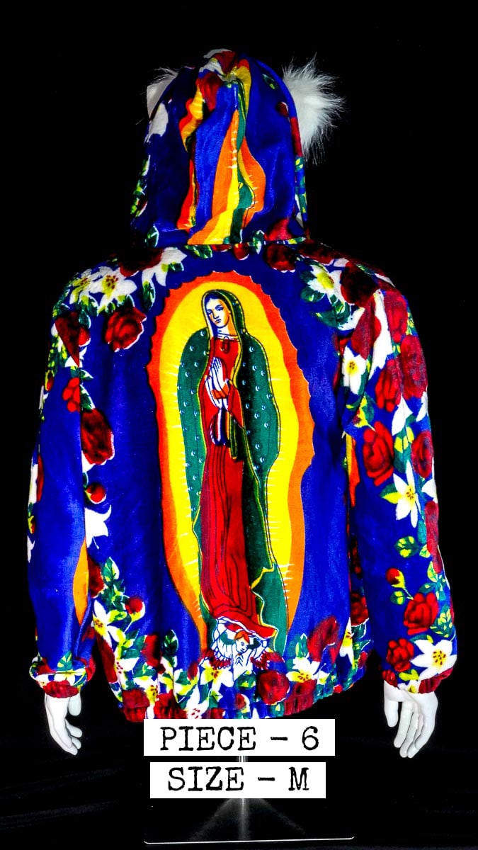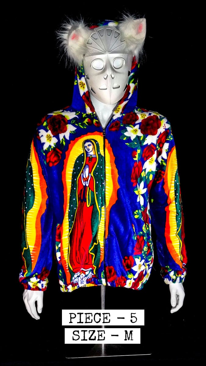 The Maria is a RAW-class statement jacket built around repetition and presence. Featuring the Virgin of Guadalupe across the front, back, and sleeves, with roses, white florals, and cherubs throughout, it’s lightweight, unlined, and unapologetically vivid.