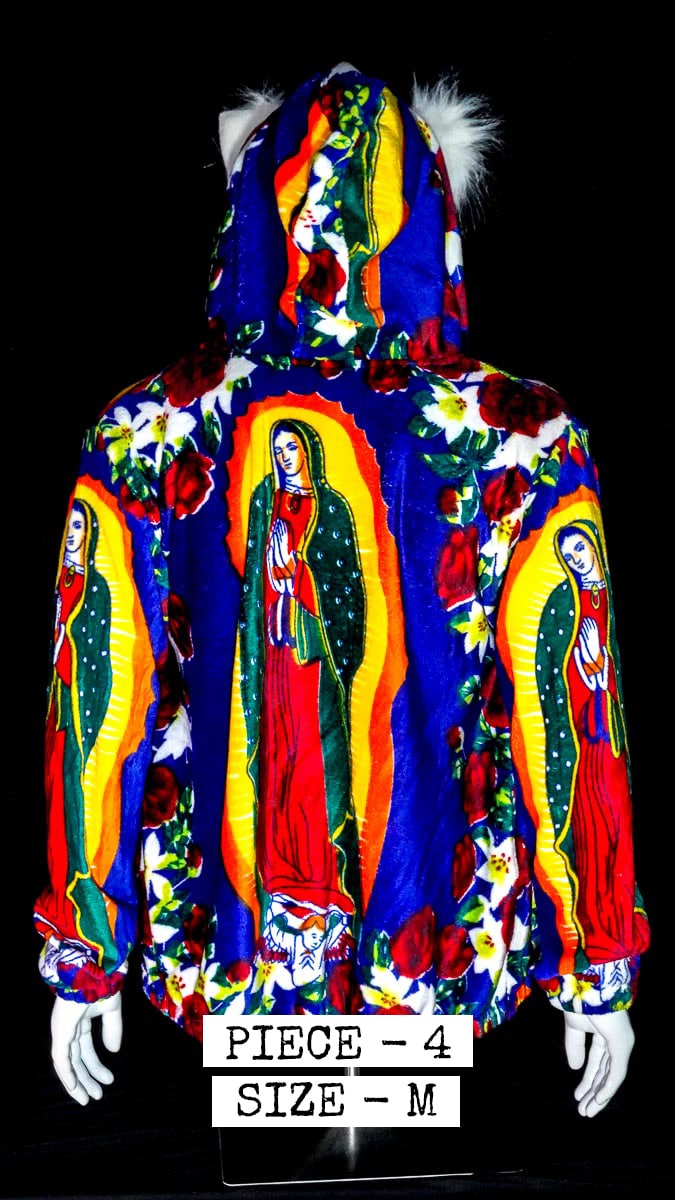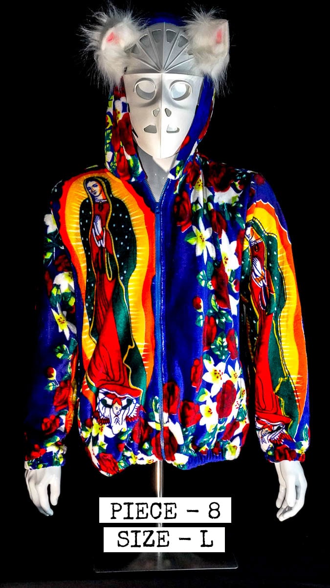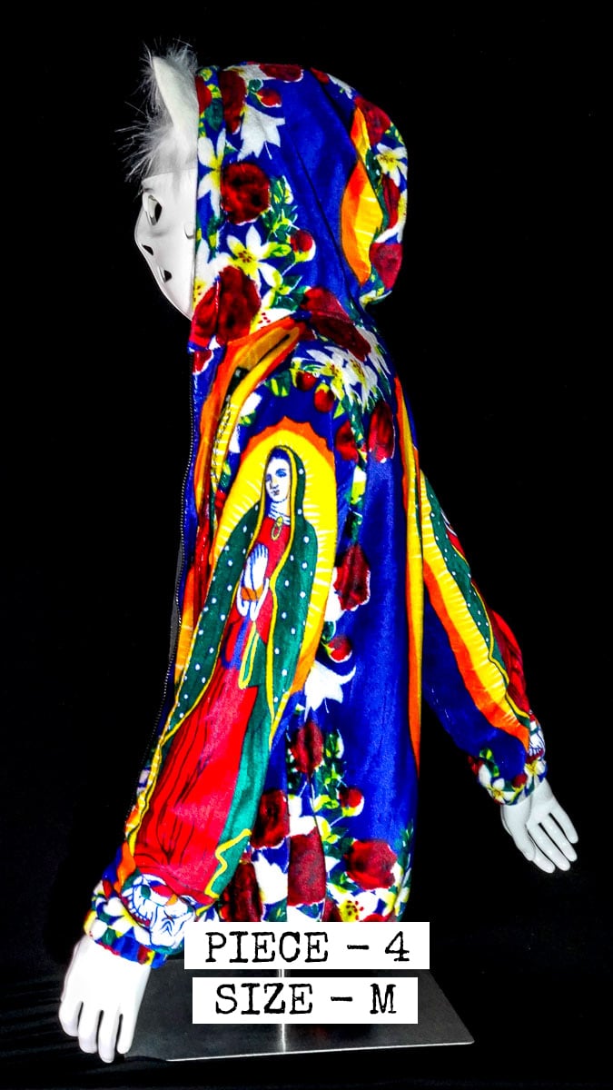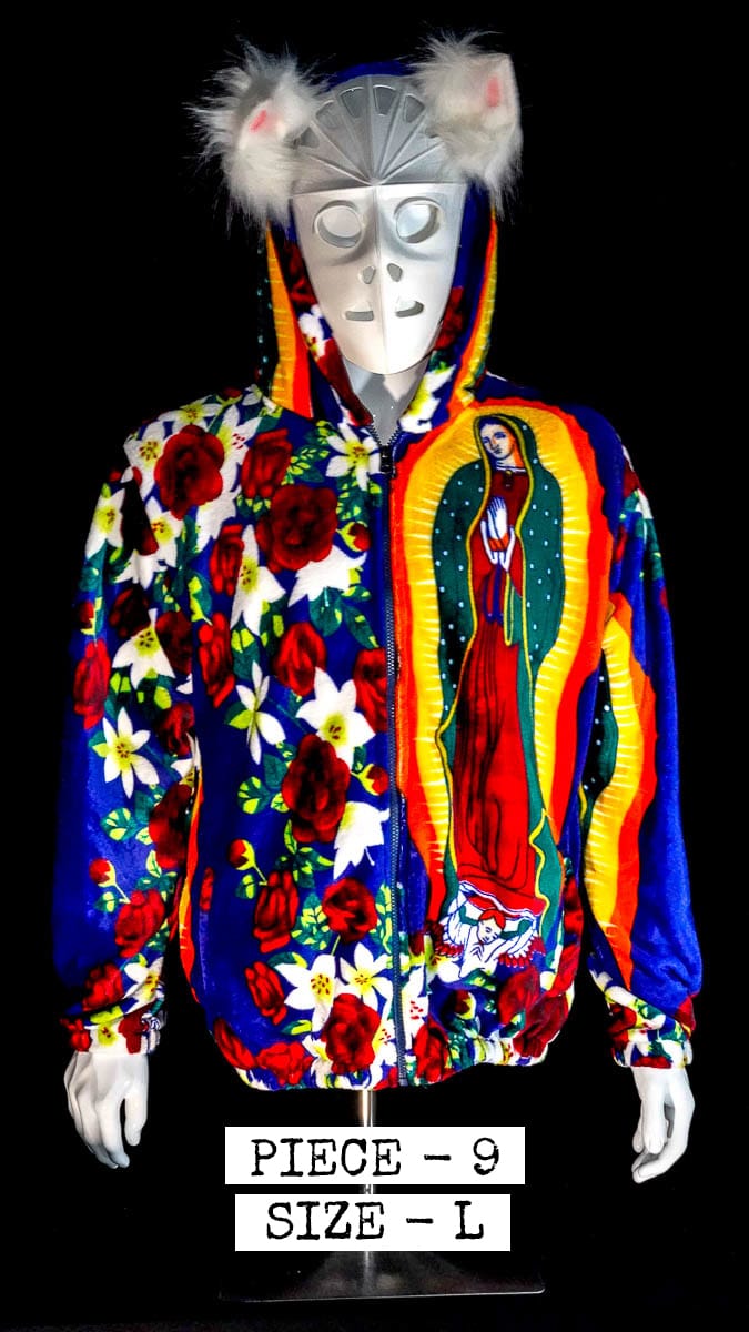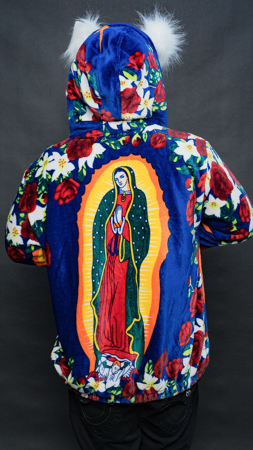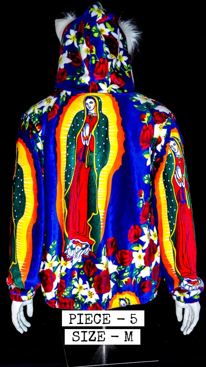 The Maria is a RAW-class statement jacket built around repetition and presence. Featuring the Virgin of Guadalupe across the front, back, and sleeves, with roses, white florals, and cherubs throughout, it’s lightweight, unlined, and unapologetically vivid.