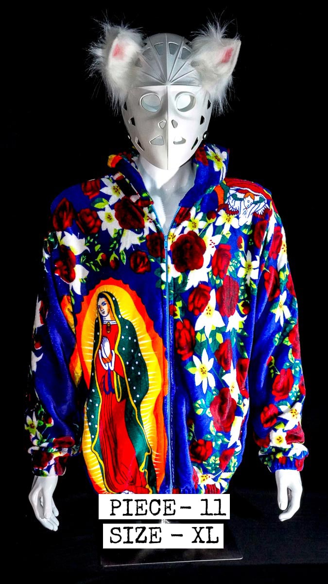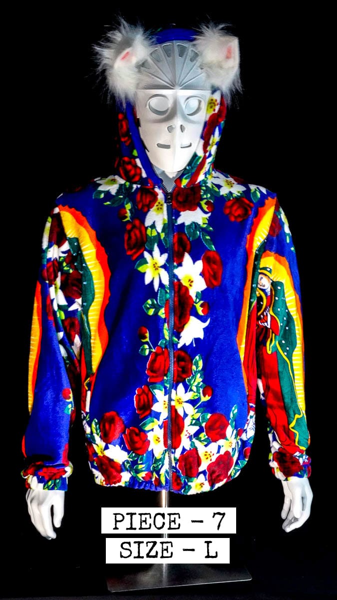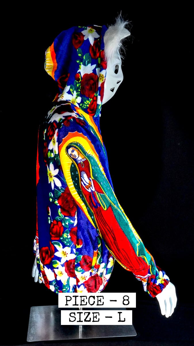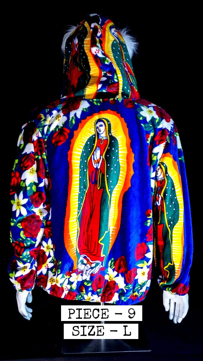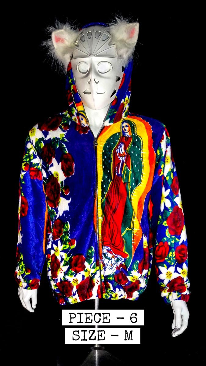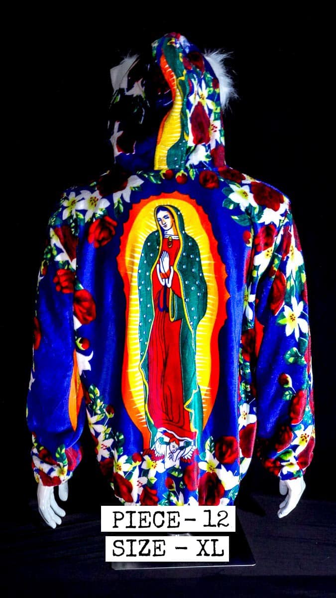 The Maria is a RAW-class statement jacket built around repetition and presence. Featuring the Virgin of Guadalupe across the front, back, and sleeves, with roses, white florals, and cherubs throughout, it’s lightweight, unlined, and unapologetically vivid.