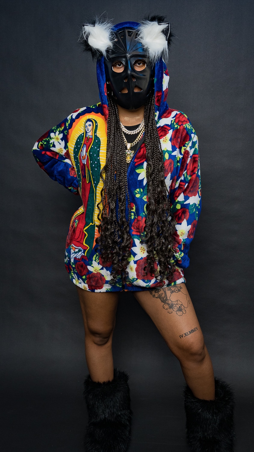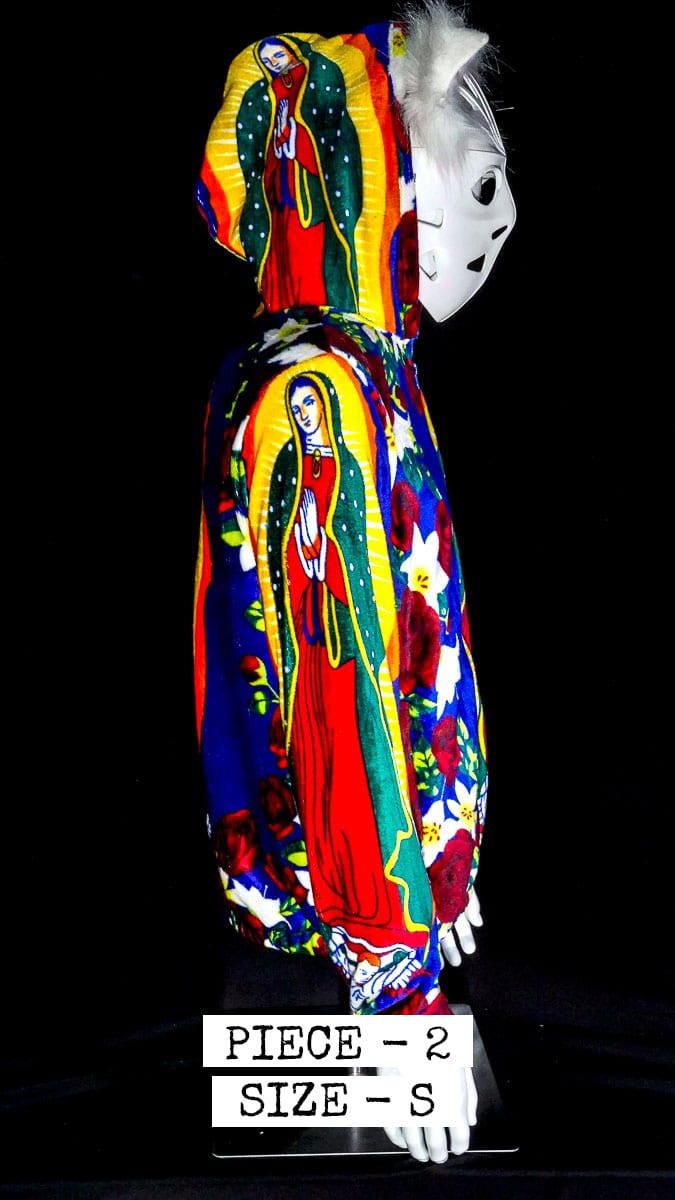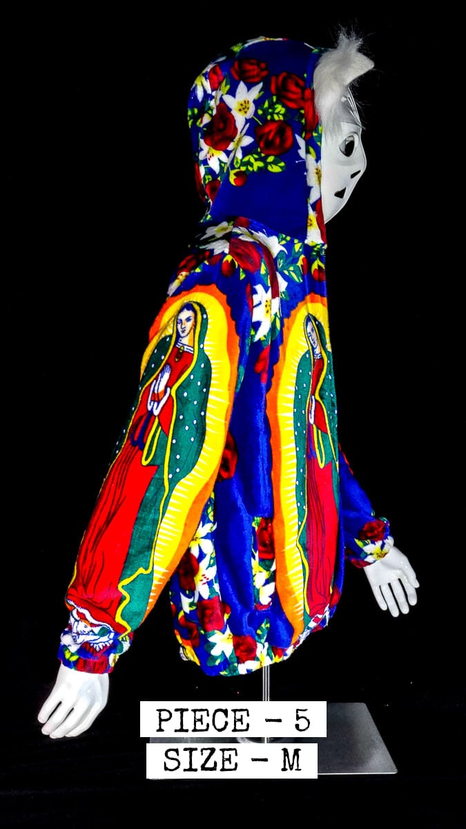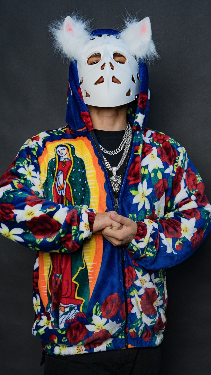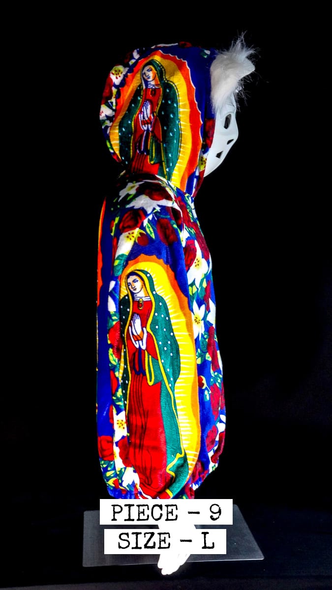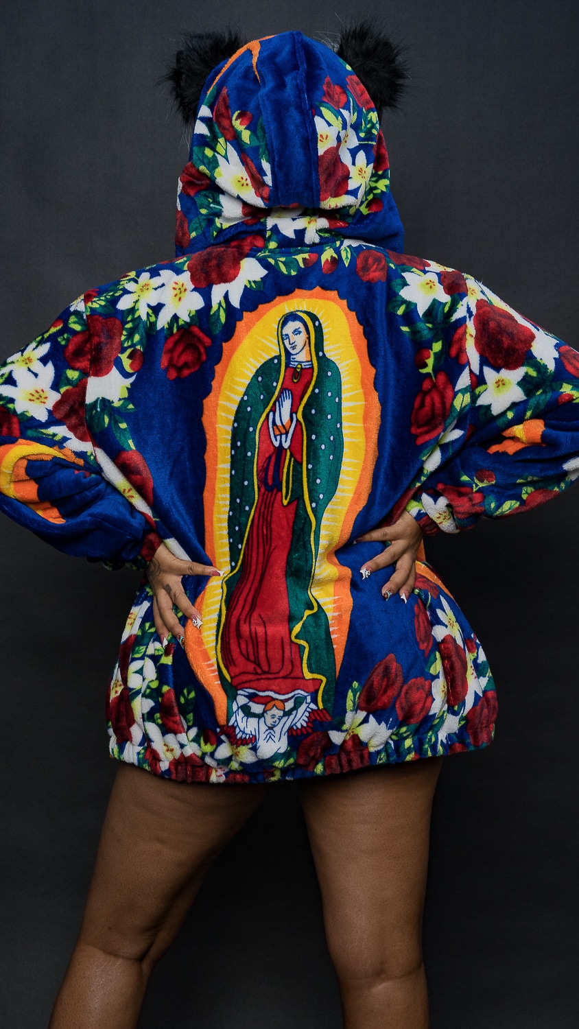 The Maria is a RAW-class statement jacket built around repetition and presence. Featuring the Virgin of Guadalupe across the front, back, and sleeves, with roses, white florals, and cherubs throughout, it’s lightweight, unlined, and unapologetically vivid.