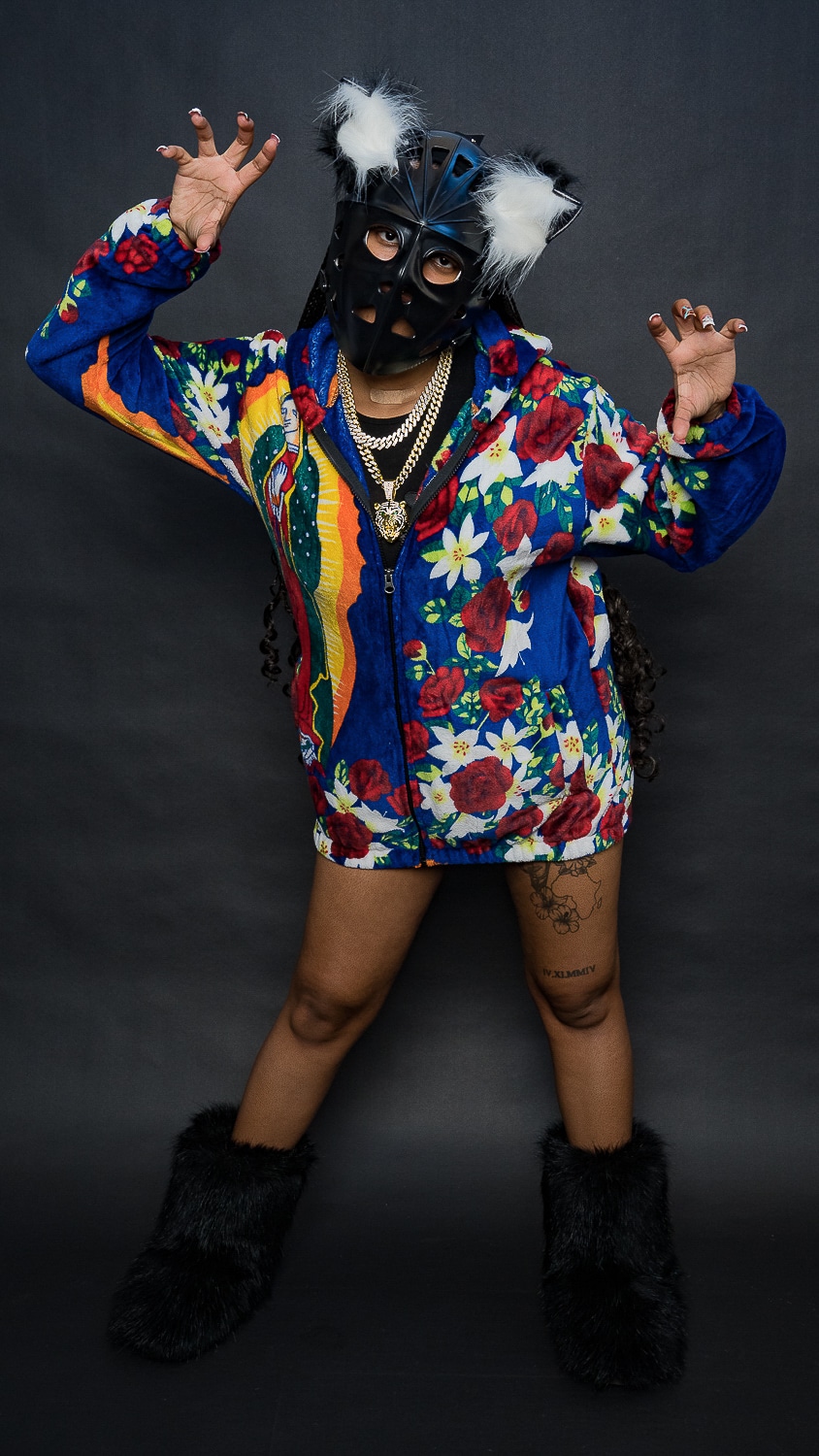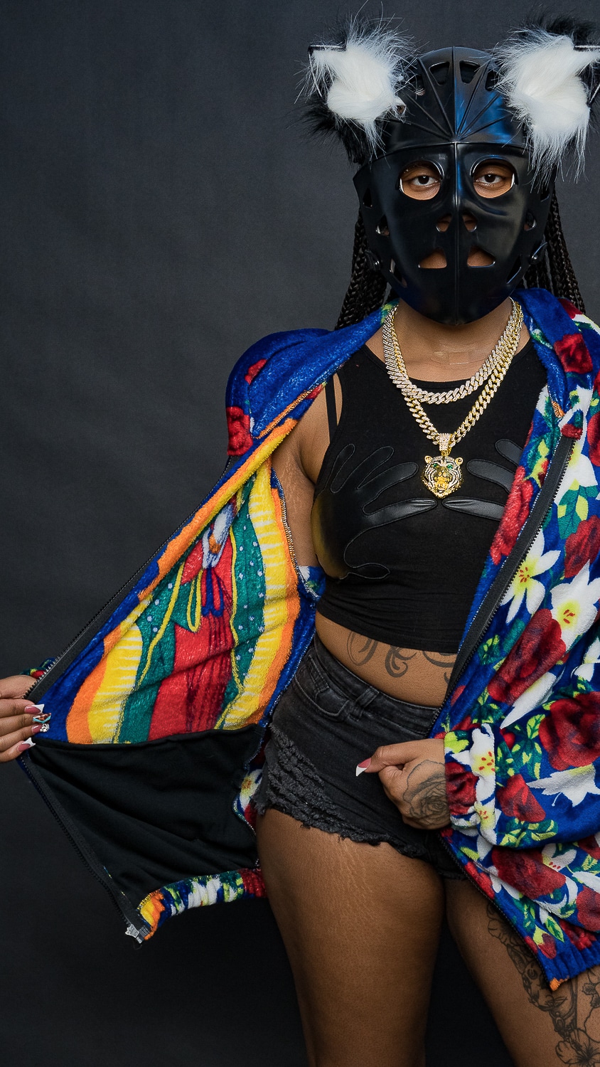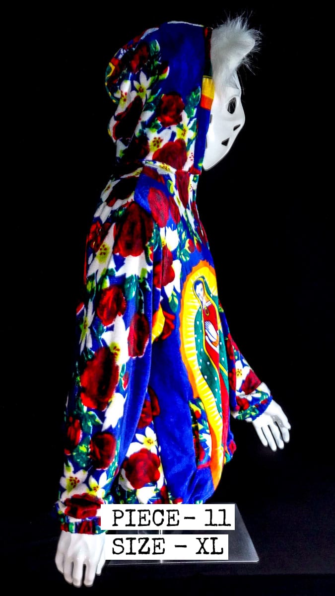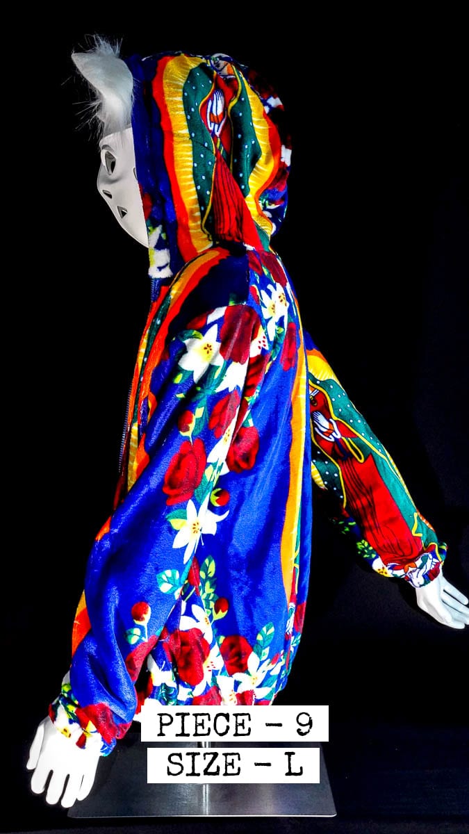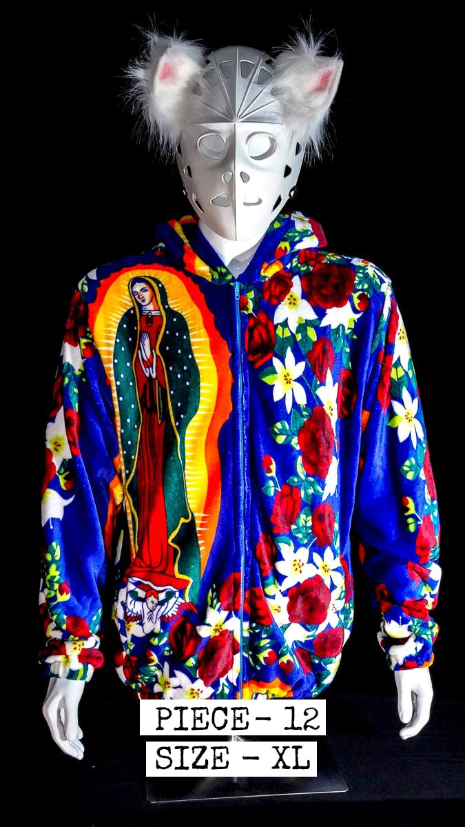 The Maria is a RAW-class statement jacket built around repetition and presence. Featuring the Virgin of Guadalupe across the front, back, and sleeves, with roses, white florals, and cherubs throughout, it’s lightweight, unlined, and unapologetically vivid.