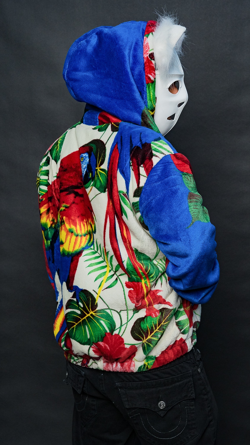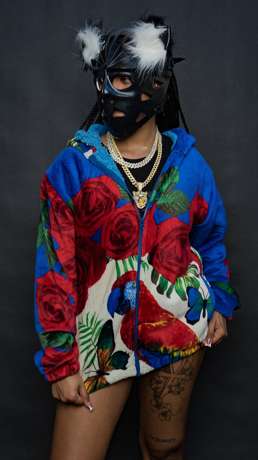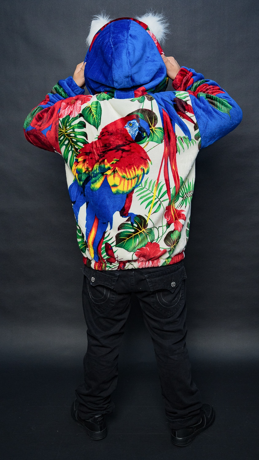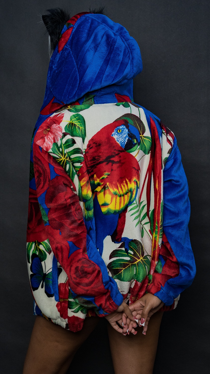 The Scarlet Aviary is a Primal-class, fully lined statement jacket built for presence. Ultra-soft, heavy in hand, and unapologetically loud, it features oversized tropical artwork, a relaxed unisex fit, and hidden utility throughout.